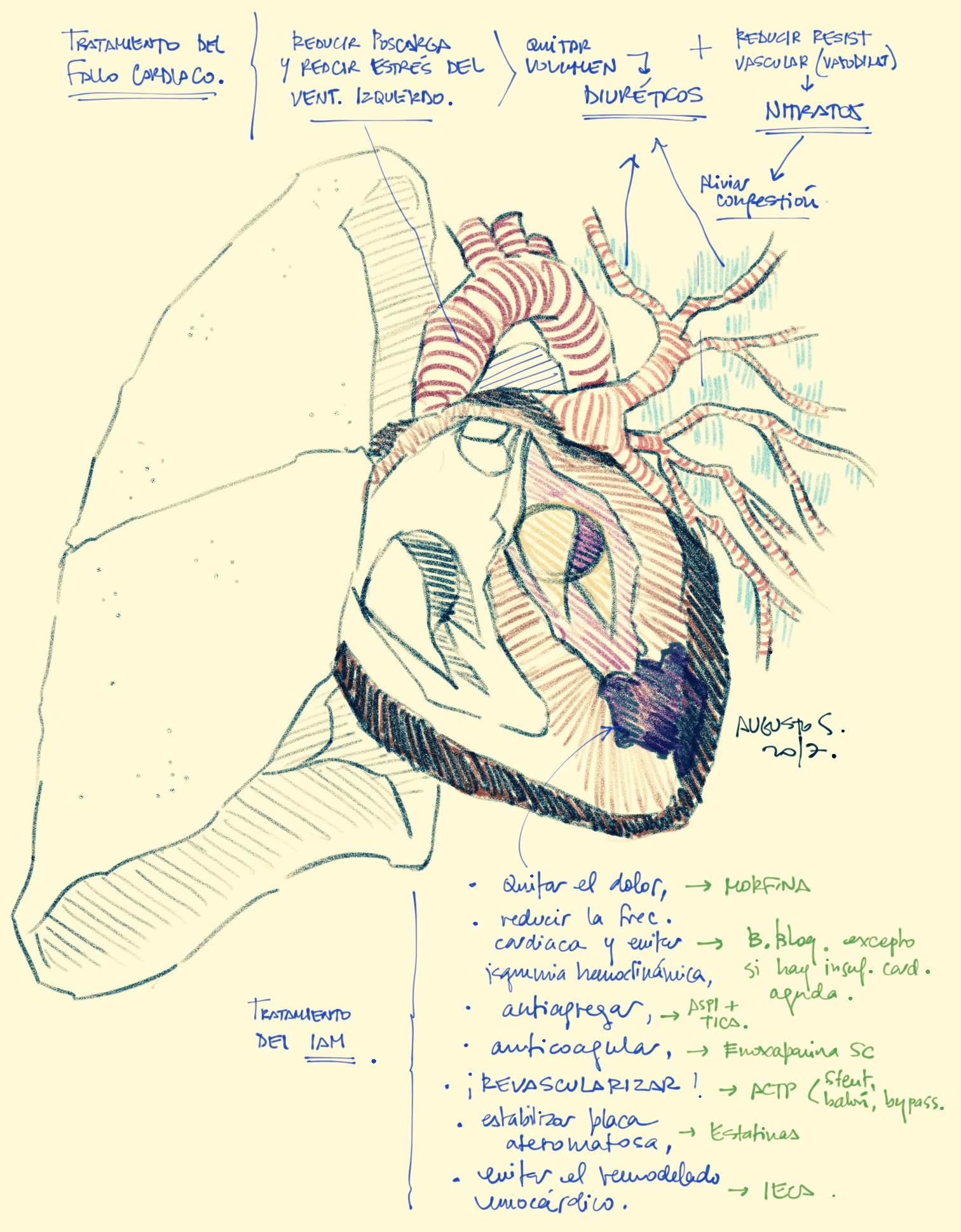 Fisiopatología del fallo ventricular izquierdo y del edema pulmonar resultante (cardiogénico) después de un infarto agudo del miocardio.Resumen breve del manejo inicial del infarto y del edema pulmonar.