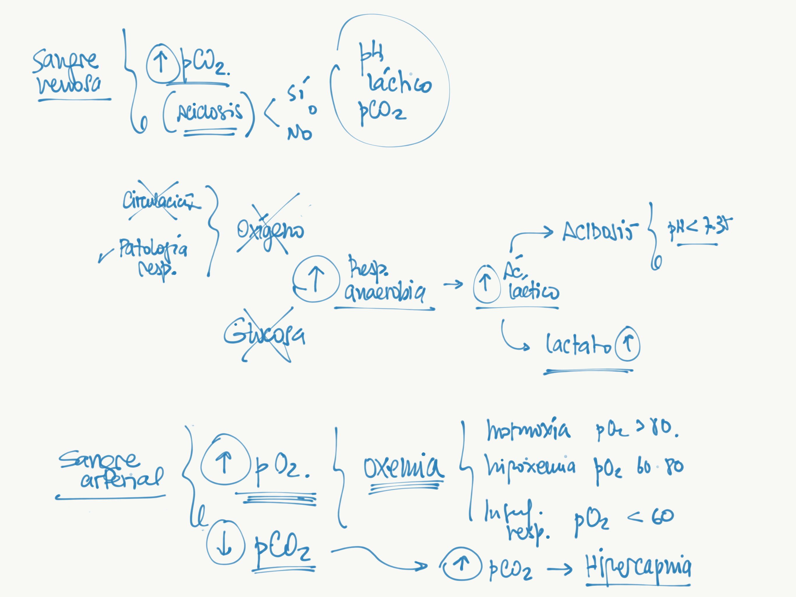 - Gasometría venosa: Me da información sobre la acidosis de forma cualitativa. Es decir, hay o no acidosis, a través del pH, ácido láctico y bicarbonato. Es muy útil cuando queremos valorar si existe acidosis o no, como en una descompensación diabética, o en un fallo circulatorio con hipotensión importante (ejemplo: shock séptico).
