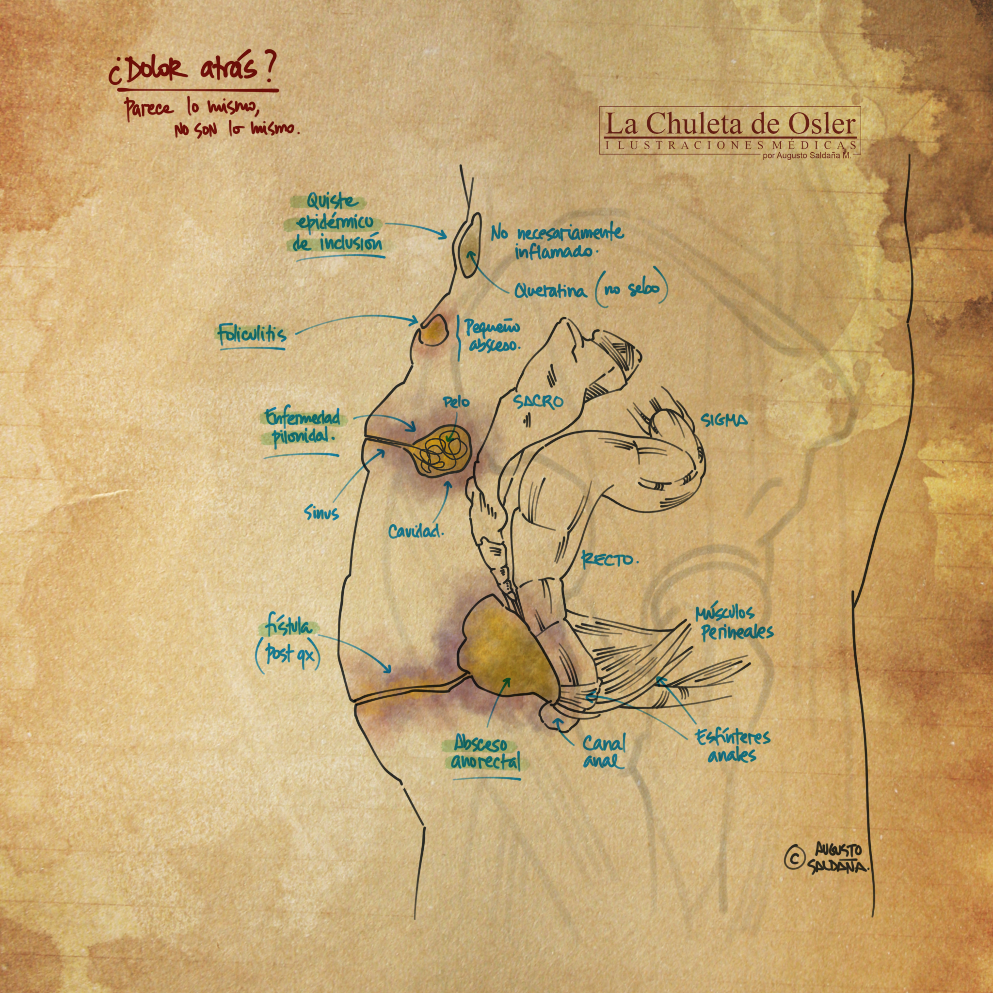 Un paciente aparece en la urgencia con dolor atrás. Exploras el sacro y la región glútea y observas una lesión noudular endurecida y muy flogótica: gran aspecto inflamatorio y quizá infeccioso. Cuál es el diagnóstico?