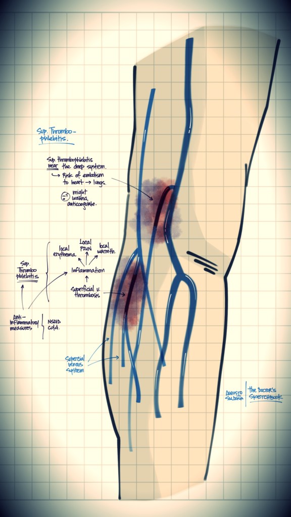 - En esta serie ilustrativa mostramos el sistema venoso y LA DIFERENCIA entre el sistema venoso SUPERFICIAL y el PROFUNDO SANO. La segunda imagen relata los eventos a tener en cuenta en una tromboflebitis SUPERFICIAL. Finalmente, la 3ra ilustración describe una trombosis venosa PROFUNDA, o TVP, más patológica y que requiere un tratamiento más agresivo e inmediato por su alto riesgo de embolia pulmonar.