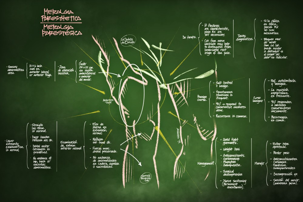A continuación un video explicativo, a través de un caso clínico, se esta enfermedad puramente sensitiva, causada por la compresion del nervio femorocutaneo lateral: