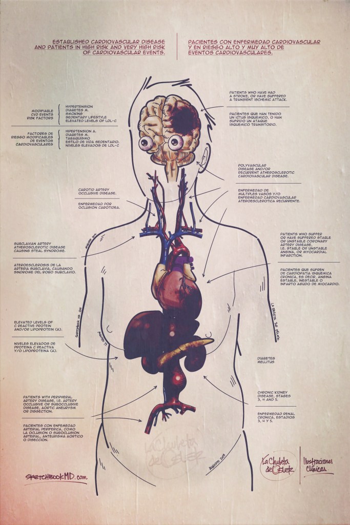 Cabe resaltar que aunque no debe ser lo único a modificar, el uso de estatinas para reducir el colesterol LDL hasta 70 mg/dL (por consenso de expertos) sí ha demostrado beneficio con reducción del riesgo absoluto. Cabe decir también que los pacientes con diabetes mellitus y con enfermedad renal crónica se consideran pacientes con enfermedad cardiovascular establecida y también pertenecen a ese grupo con riesgo muy alto de un siguiente evento (De ahí que esté escrito que los pacientes con diabetes y enfermedad renal crónica mueren más frecuentemente por eventos cardiovasculares y no de una complicación directa de su enfermedad crónica).
