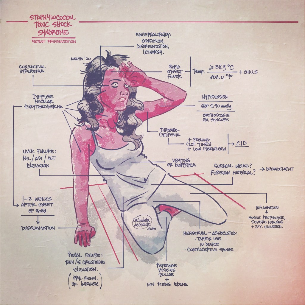 La siguiente ilustración busca resumir los sucesos durante una secuencia de shock por toxinas de estafilococo tras una infección invasiva. En los 70s y 80s se vio un pico en la incidencia mujeres asociado a uso de tampones. Sin embargo, puede ocurrir en el contexto de cualquier infección invasiva, como en el caso de una herida infectada, o material quirúrgico no recogido o retenido. La secuencia tiene todas las características de shock, con hipotensión sostenida, hipoperfusión tisular y fallo orgánico secuencial. Todo lo mencionado debido a una respuesta inflamatoria disregulada con activación incluso de la coagulación y consumo de sus factores con la consecuente hemorragia.