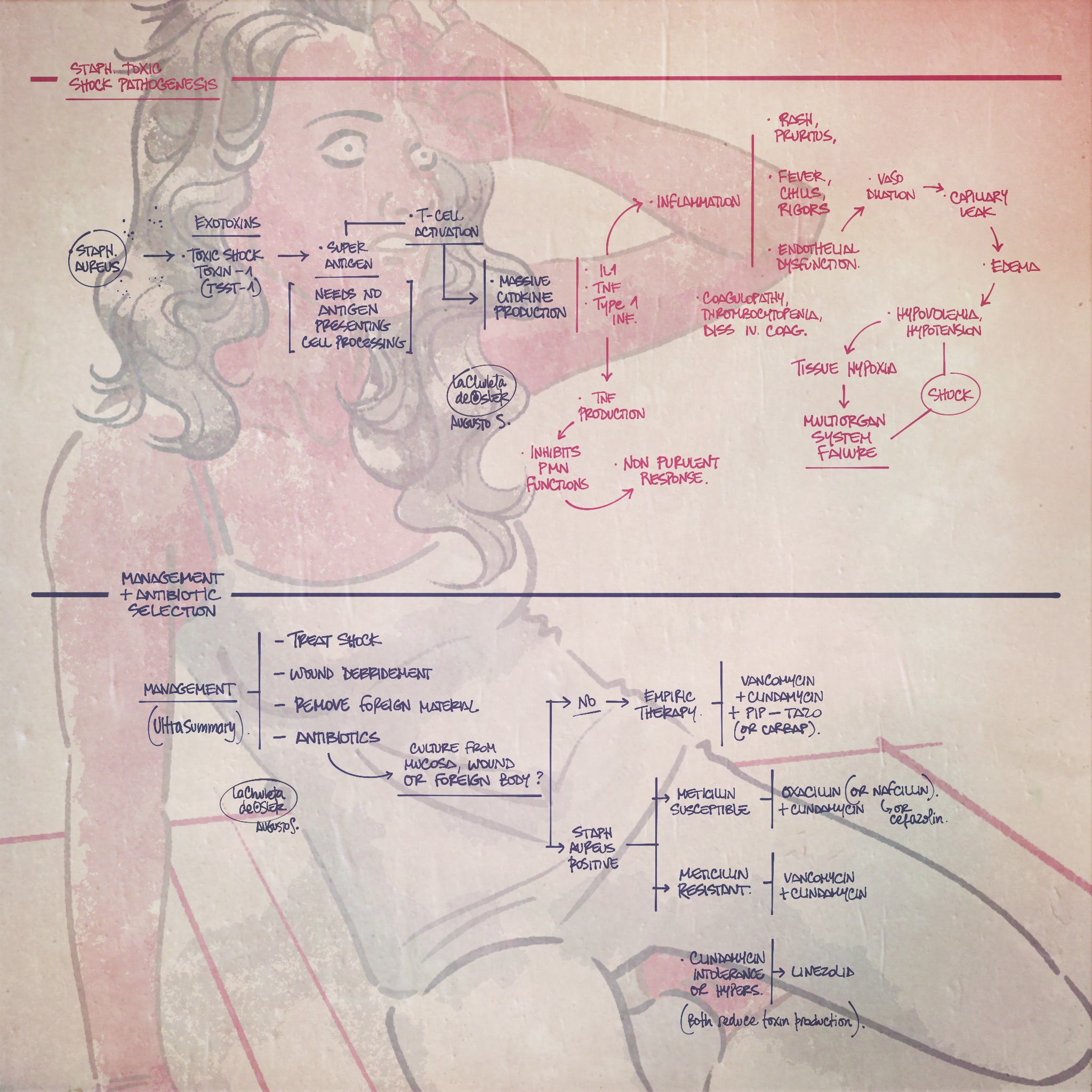 La siguiente ilustración busca resumir los sucesos durante una secuencia de shock por toxinas de estafilococo tras una infección invasiva. En los 70s y 80s se vio un pico en la incidencia mujeres asociado a uso de tampones. Sin embargo, puede ocurrir en el contexto de cualquier infección invasiva, como en el caso de una herida infectada, o material quirúrgico no recogido o retenido. La secuencia tiene todas las características de shock, con hipotensión sostenida, hipoperfusión tisular y fallo orgánico secuencial. Todo lo mencionado debido a una respuesta inflamatoria disregulada con activación incluso de la coagulación y consumo de sus factores con la consecuente hemorragia.