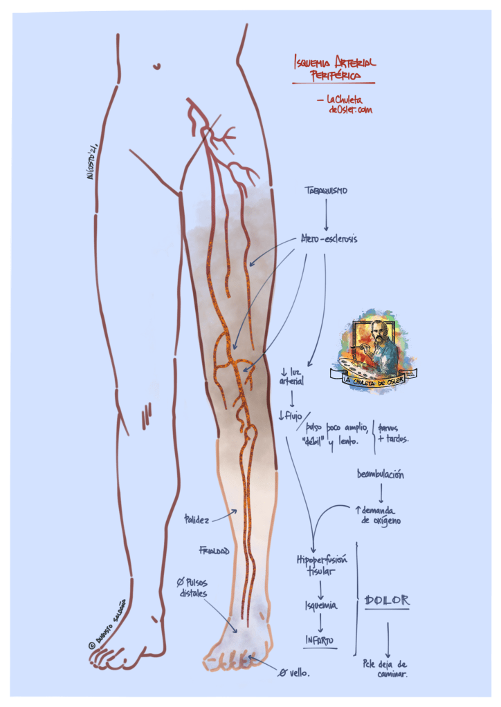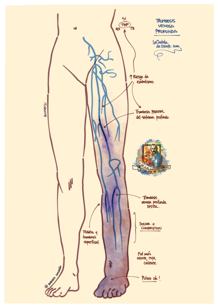 Trombosis venosa profunda: riesgo de trombofilia, inmovilidad, congestión, aumento de volumen y eritema de la extremidad. El diagnóstico es clínico, y la confirmación puede apresurarse con ecografía a pie de cama: no compresibilidad del sistema venoso profundo. El tto pasa por el uso de anticoagulantes orales o parenterales.Isquemia arterial periférica aguda: asociada a claudicación intermitente, riesgo cardiovascular elevado, es decir asociar HTA, DM2, tabaquismo, hipercolesterolemia, etc. Adicionalmente, podría también asociarse a embolia, como en el caso de una persona con FA. Al contrario de lo anterior, el dolor, muy agudo, se presenta con extremidad pálida, fría, con ausencia de pulsos periféricos. Dependiendo de la gravedad de la isquemia, son visibles áreas de cianosis y úlceras necróticas. El diagnóstico es clínico, confirmado por eco y arteriografía. El manejor será la reperfusión.