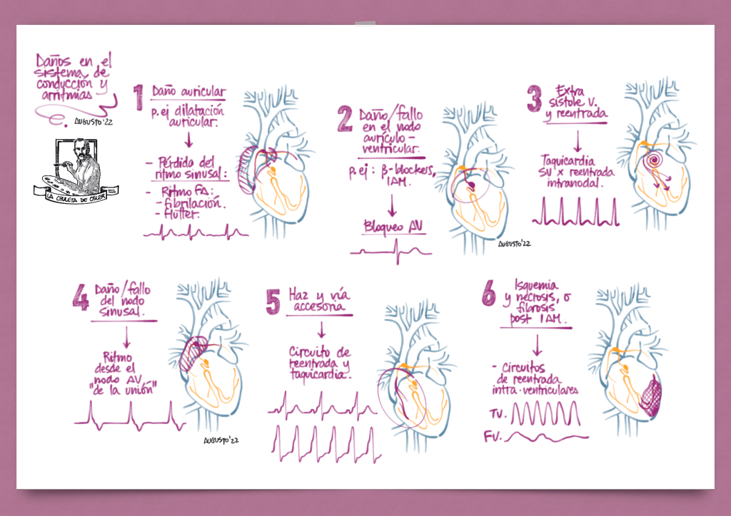 En la siguiente ilustración pordemos observar la explicación visual de la fisiopatología de algunas de las arritmias más comunes, algunas supraventriculares (QRS estrecho) y ventriculares (QRS ancho):
