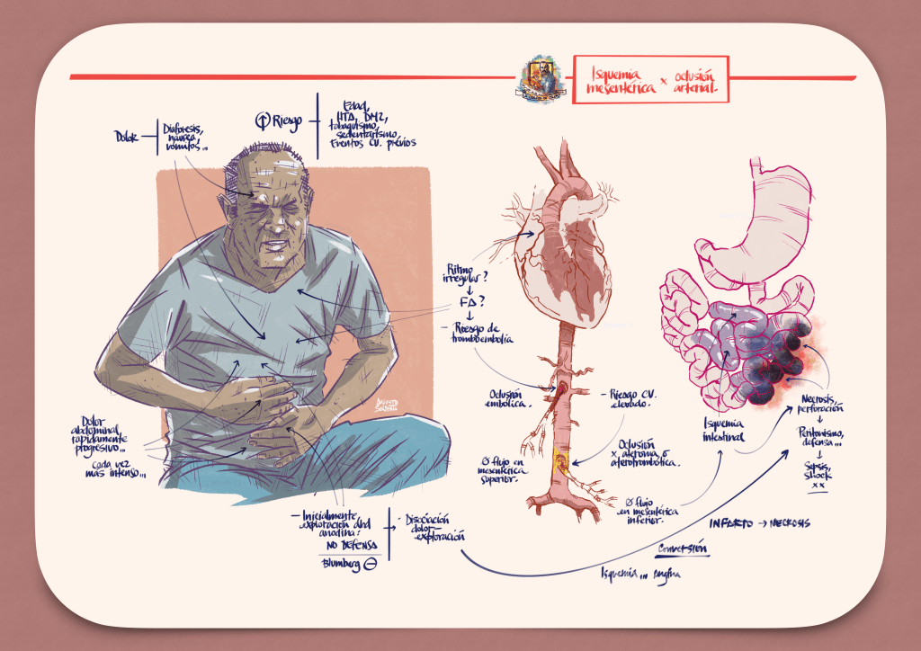 A continuación presentamos un breve resumen de la fisiopatología y la clínica resultante de la isquemia mesentérica por oclusión arterial, y el resultante infarto y necrosis intestinal. El contexto del paciente desde sus antecedentes patológicos es muy importante, puesto que la enfermedad por oclusión arterial puede ser aterotrombótica (paciente con elevado riesgo cardiovascular y eventos cardiovasculares previos), o trombo/cardioembólica (paciente con fibrilación auricular no diagnósticada, o diagnósticada sin tratamiento adecuado).